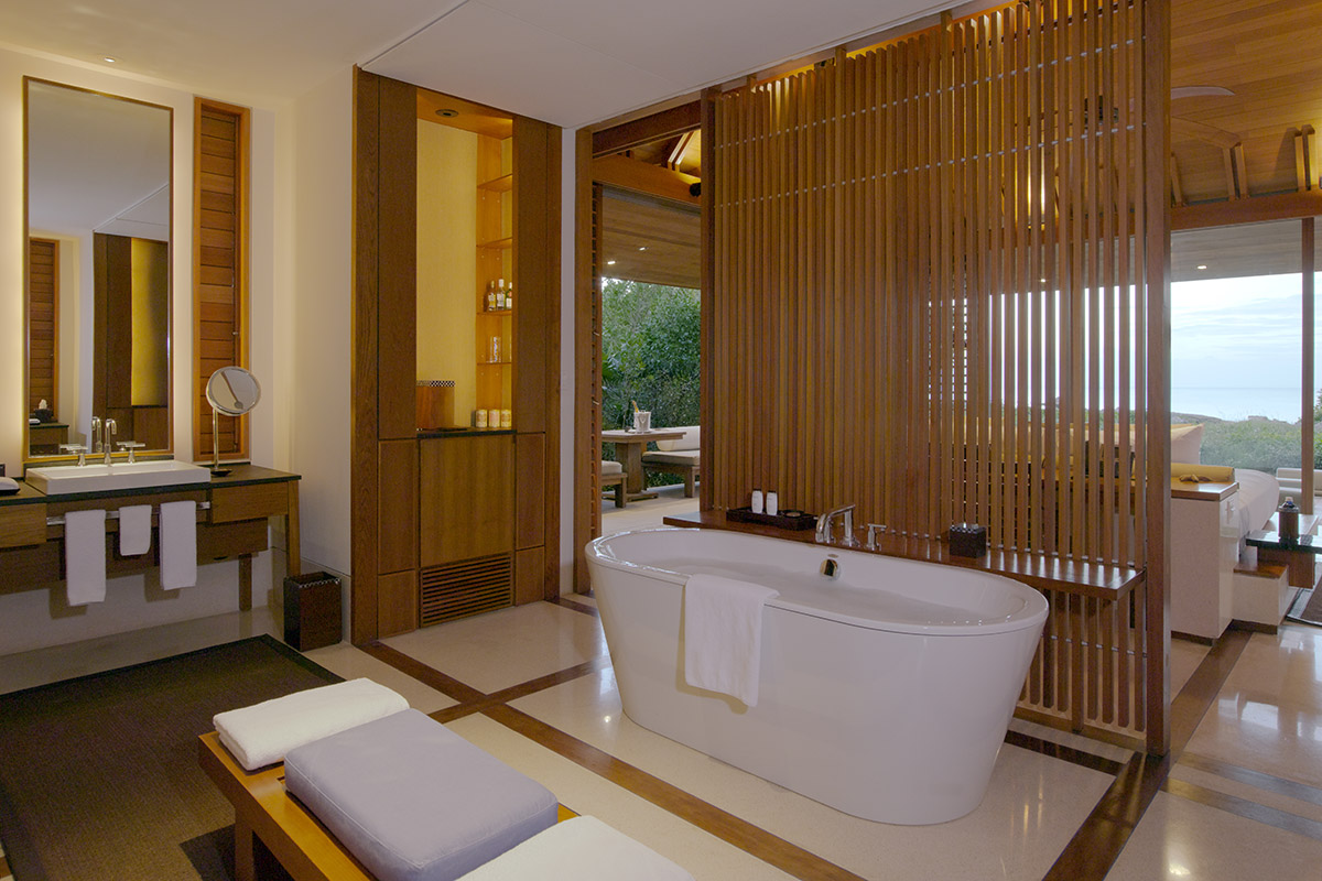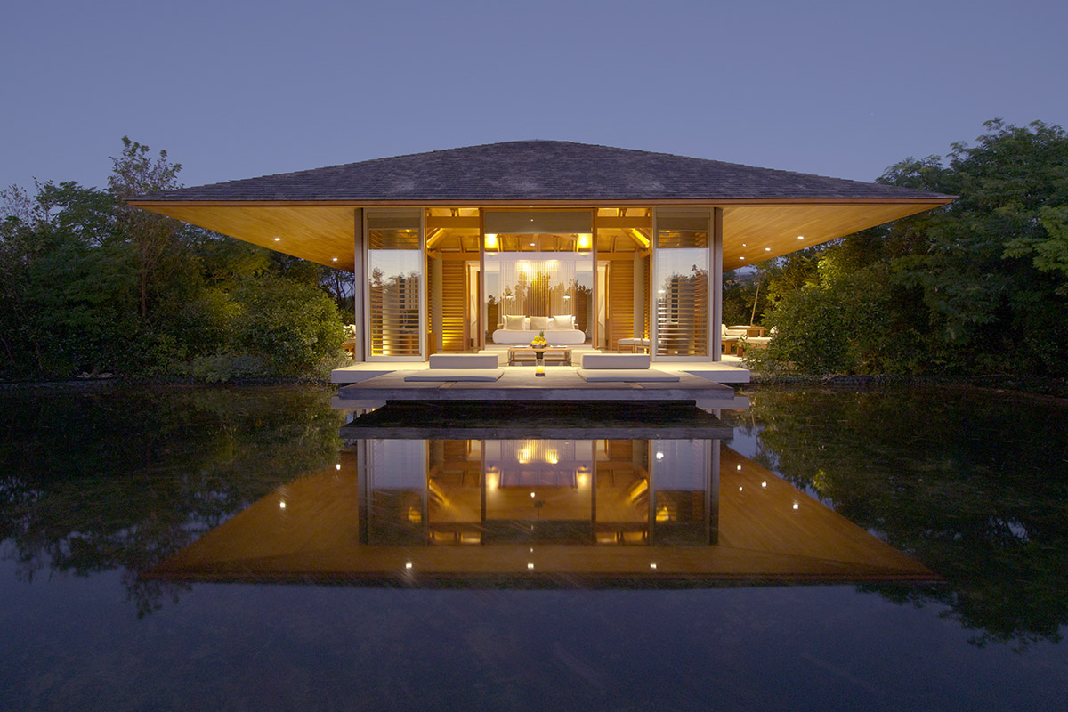 Three to five bedroom Villas offer exclusivity on the edge of tranquil ponds, nestled in vegetation along the shoreline, overlooking the oceanfront or on the beach. Each villa encompassed a series of Pavilions, living/dining pavilion, outdoor dining sala, private swimming pool, some with reflecting ponds, serviced by a personal cook, housekeeper and a couple of golf buggies. Central king-size bed, two daybeds, two vanities, freestanding bath, and a rain shower. Three shaded terraces offer twin banquettes for lounging/dining, sunken table with cushions, bolsters and two sunning mats. Amenities include: Air Conditioning, bathrobes, clock radio, DVD/CD player, full kitchen, entertainment unit, hair dryer, in-room safe, iron/board, mini bar, quality bath amenities, wireless internet. Standard occupancy 6 (12max).